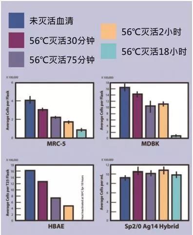 萬一小艾設錯水浴溫度或忘記按計時器,都會導致過高的加熱溫度(下圖2)或過長的加熱時間(下圖3),進而大大降低血清的功能,影響細胞生長的表現。 ▲圖2:過高的加熱溫度降低大多細胞株生長速度(僅一株未受明顯影響)。 ▲圖3:過長的加熱時間降低大多細胞株生長速度(僅一株未受明顯影響)。 且滅活加熱過程會增加血清的沉淀狀況,而沉淀又常常被認為是微生物的污染,進而耗費大量時間及精力驗證是否污染,導致實驗一再拖延。 我的細胞一定要用滅活血清怎么辦?