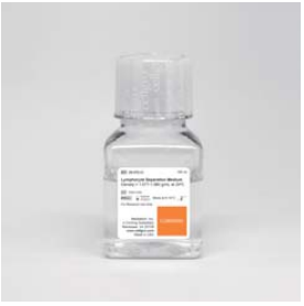 淋巴細胞分離液 (LSM) 可用于在體外從稀釋的全血中進行淋巴細胞的分離。其分離原理為密度梯度離心,利用全血中不同細胞類型比重的差異通過離心完成細胞的分離 (圖1)。康寧 cellgro®淋巴分離液是一種無菌的等滲聚蔗糖和泛影酸鈉溶液,粘度低,在20℃下密度為1.077-1.080g/mL。